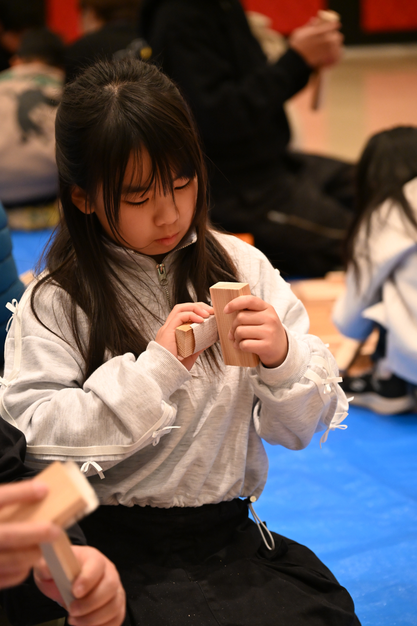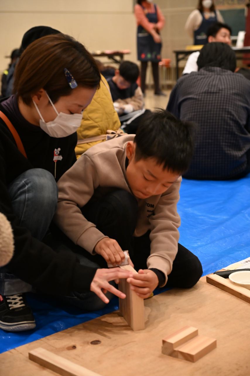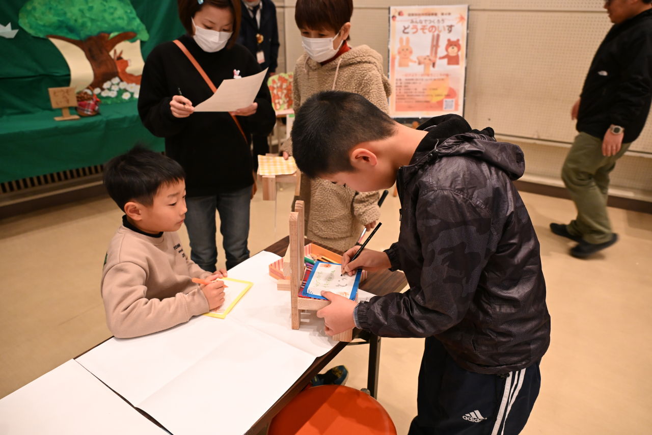 山本真市さんの指導のもと、絵本に登場する「どうぞのいす」をイメージした椅子づくりに挑戦しました。親子や参加者同士が協力して制作する姿が多くみられました。